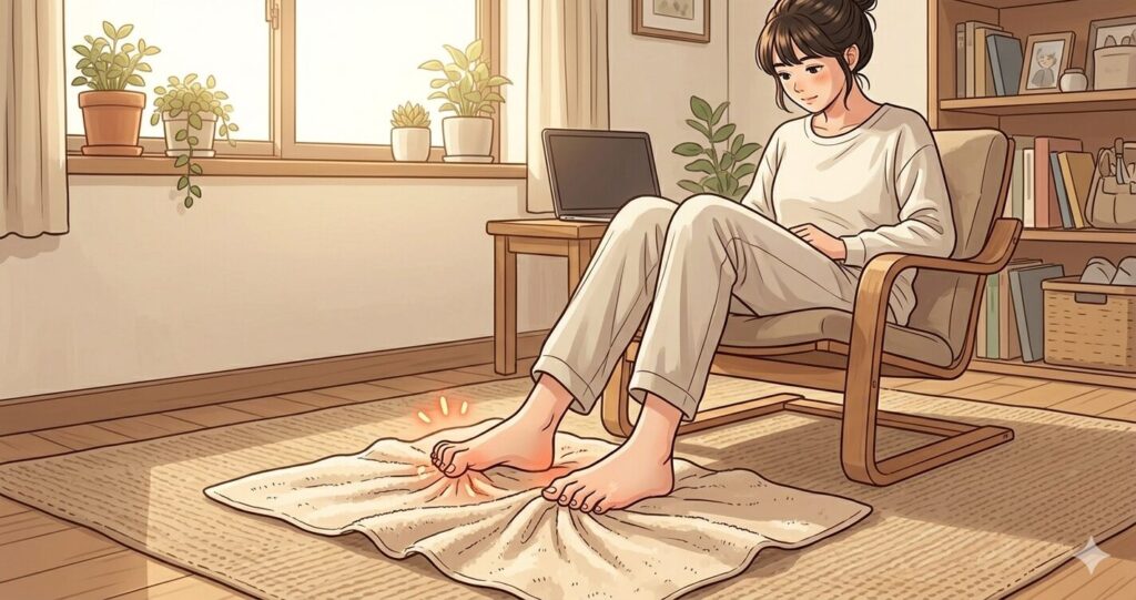床に広げたタオルを、足の指でギュッと引き寄せるだけ。