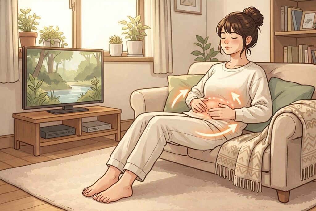 鼻から息を吸いながらお腹を膨らませ、口からゆっくり吐きながらお腹をへこませます。