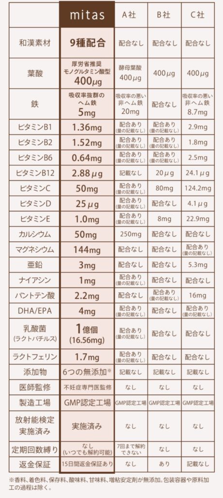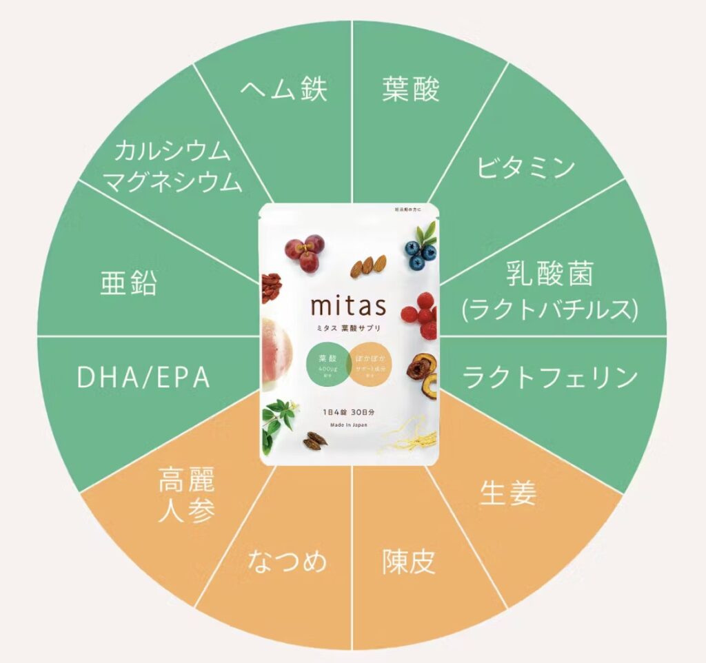 私が以前からおすすめしている、温活できる葉酸サプリ・mitasには、どちらも含まれています。